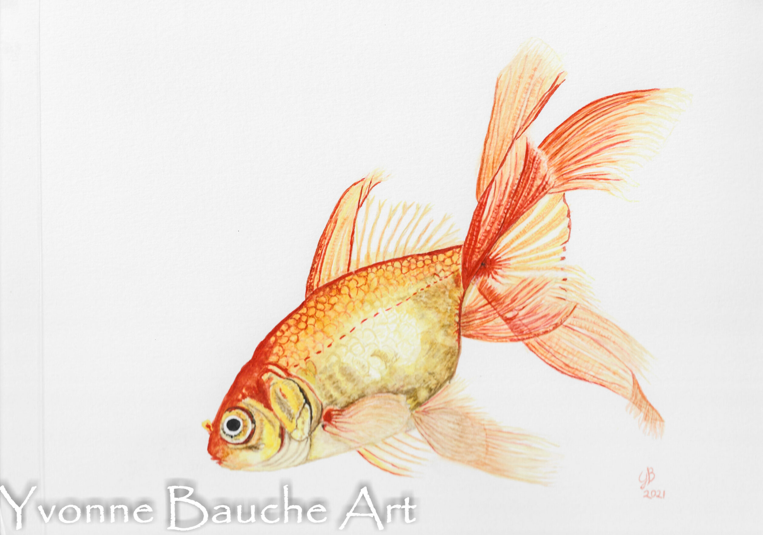Painting this goldfish was a lot of fun, especially capturing all the fine detail in the fins and scales. This was produced using only regular watercolour paints, with no gold or luster added.